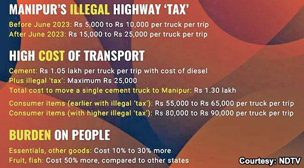 কয়েক দশক ধরে মণিপুরে অবৈধ হাইওয়ে ‘ট্যাক্স’ আদায় চলছে। মণিপুরের দুটি জাতীয় মহাসড়কের দীর্ঘ প্রসারিত দূরবর্তী পাহাড়ের মধ্য দিয়ে গেছে, যেখানে বিদ্রোহী এবং দুর্বৃত্তরা সহজেই ধীরগতির ট্রাক থামাতে পারে এবং চালকদের কাছ থেকে টাকা নিতে পারে।
