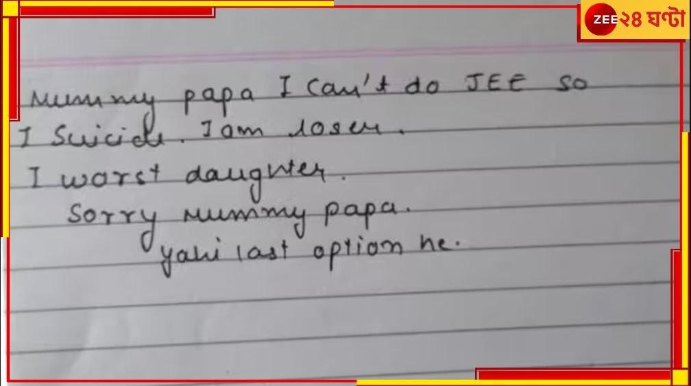 অত্যন্ত মর্মান্তিক এই ঘটনার পর ফের প্রশ্নের মুখে কোটায় জয়েন্টের প্রস্তুতি নিতে যাওয়া পড়ুয়াদের মানসিক চাপের প্রসঙ্গ। দুদিন পর, বুধবার, ৩১ জানুয়ারি-ই ছিল জয়েন্ট পরীক্ষা। তার আগে সোমবার-ই বাবা, মা-কে চিঠি লিখে চরম পথ বেছে নেয় ওই পড়ুয়া। পরীক্ষা ভীতি, মানসিক চাপেই ওই পড়ুয়া আত্মঘাতী হয়। যা স্পষ্ট তার লেখা সুইসাইড নোটে। চিঠিতে সে লিখেছে, “মা-বাবা, আমি জয়েন্টে পারব না। তাই আমি আত্মহত্যা করছি। আমি একজন হেরে যাওয়া মানুষ। আমি-ই কারণ। আমি সবচেয়ে খারাপ মেয়ে। সরি, মা-বাবা। এটাই শেষ উপায়।” জানা গিয়েছে, ১৮ বছরের ওই জয়েন্ট পরীক্ষার্থী রাজস্থানের কোটায় থেকে সে JEE মেইনসের প্রস্তুতি নিচ্ছিল। পরীক্ষার ২ দিন আগে কোটার শিক্ষা নগরী এলাকায় নিজের ঘরেই আত্মঘাতী হয় সে। উদ্ধার হয়েছে তার ঝুলন্ত দেহ।