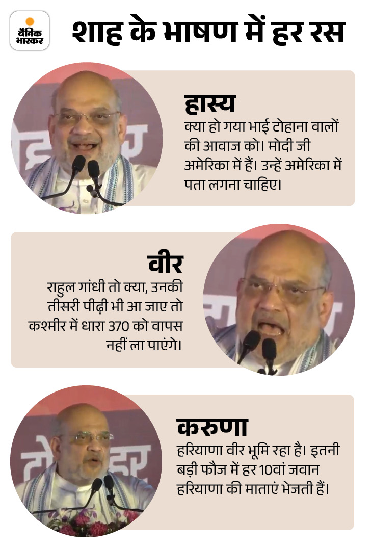উভয় সমাবেশেই শাহের 59 মিনিটের ভাষণে ফোকাস পয়েন্ট ছিল – দুর্নীতি, দলিত, সংরক্ষণ, কৃষক এবং অগ্নিবীর। দুর্নীতি প্রসঙ্গে শাহ বলেন, “যখনই হরিয়ানায় অ-বিজেপি সরকার ক্ষমতায় এসেছে, এখানে দুর্নীতি বেড়েছে।” বিজেপি সরকারের আগে রশিদ ছাড়া চাকরি পাওয়া যেত না, বিজেপি সরকারে পোস্টম্যান বাড়িতে এসে নিয়োগপত্র দেয়।