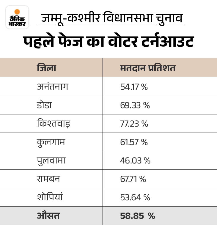 জম্মু ও কাশ্মীর বিধানসভা নির্বাচন, প্রথম ধাপে 58.85% ভোট: কিশতওয়ারে সর্বাধিক ভোট 77.23%