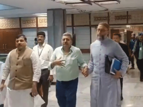 ছবিটি ৬ সেপ্টেম্বরের। আসাদুদ্দিন ওয়াইসি এবং জগদম্বিকা পাল একসঙ্গে জেপিসি বৈঠকের জন্য বৈঠক কক্ষের দিকে যান।