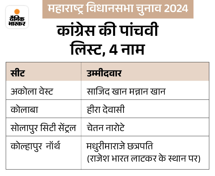 সোমবার রাতে মহারাষ্ট্র বিধানসভা নির্বাচনের পঞ্চম তালিকা প্রকাশ করেছে কংগ্রেস। এতে মোট চার প্রার্থীর নাম রয়েছে। এতে কোলহাপুর উত্তর থেকে রাজেশ ভরত লটকারের টিকিট বাতিল করে টিকিট দেওয়া হয়েছে মধুরিমারাজে মালোজিরাজে ছত্রপতিকে। কংগ্রেসের তৃতীয় তালিকায় ছিল রাজেশের নাম। রবিবার কংগ্রেস তাদের চতুর্থ তালিকা প্রকাশ করেছে। এতে ১৪টি নাম ছিল। এর পাশাপাশি এনসিপি শরদ গোষ্ঠীও সোমবার তাদের সাত প্রার্থী ঘোষণা করেছে।