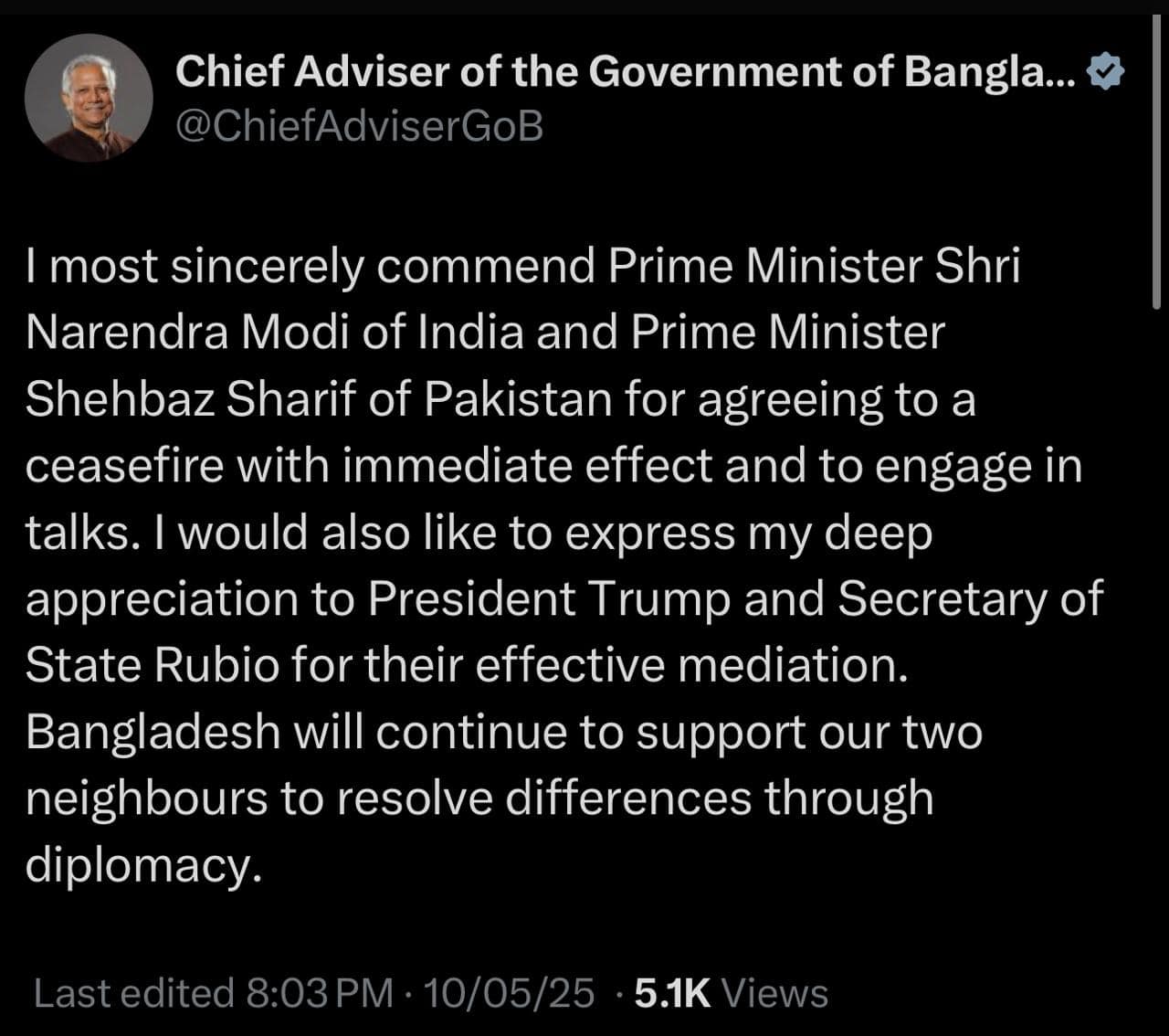 ঢাকা: ভারত-পাক সংঘাতের আবহে সমঝোতা পক্ষেই ছিল বাংলাদেশ। শনি সন্ধ্যায় সংঘর্ষবিরতির খবর সামনে আসতেই তা ‘প্রশংসনীয়’ বলে আখ্যা দিল বাংলাদেশ সরকার। এই প্রসঙ্গে বাংলাদেশের মুখ্য উপদেষ্টা সরকারের এক্স হ্যান্ডেল থেকে একটি বিবৃতি জারি করা হয়। সেখানেই সংঘর্ষবিরতির জন্য ধন্যবাদ জানানো হয় ভারতের প্রধানমন্ত্রী নরেন্দ্র মোদি এবং পাকিস্তানের প্রধানমন্ত্রী শাহবাজ শরিফকে। একইসঙ্গে প্রশংসার সুর শোনা গিয়েছে মার্কিন প্রেসিডেন্ট ডোনাল্ড ট্রাম্প এবং পররাষ্ট্র মন্ত্রী মার্কো রুবিও-কে নিয়েও। ওই বিবৃতিতে বলা হয়েছে মার্কিন প্রেসিডেন্ট এবং রুবিও-এর ‘কার্যকরী’ মধ্যস্থতায় এই সংঘর্ষবিরতি সম্ভব হয়েছে। বিবৃতির শেষের কিছু লাইন নিয়ে অবশ্য ধোঁয়াশা রয়ে গিয়েছে। সেই লাইনে লেখা রয়েছে, “বাংলাদেশ দুই দেশের সমস্যা নিজের কূটনৈতিক মাধ্যমে মেটানোর চেষ্টা করে যাবে।”
