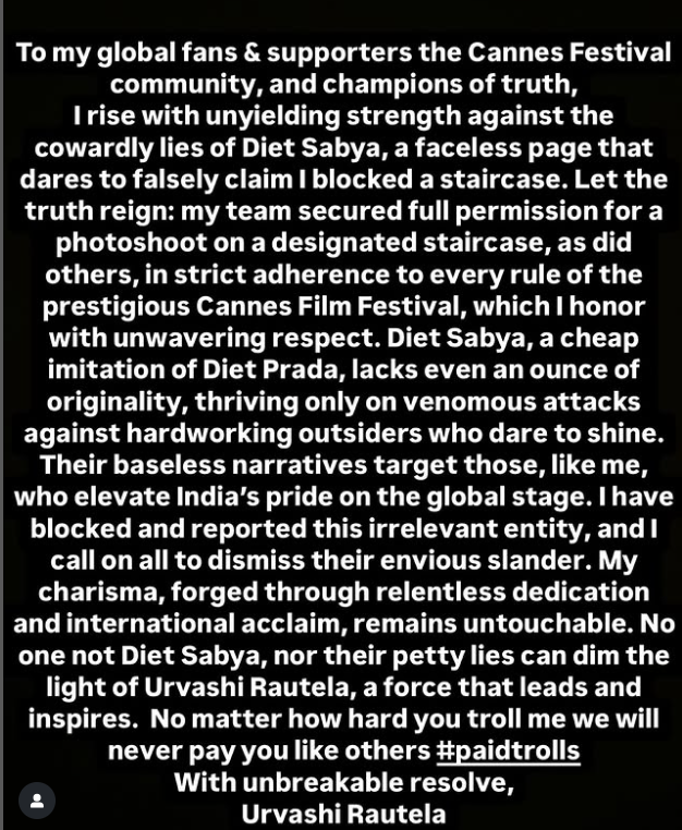 এগুলি ছাড়াও উর্বশীও এই রিপোর্টে নীরবতা ভেঙে দিয়েছেন যে বলা হয় যে উর্বশীকে কানের লাল কার্পেটে পোজ দেওয়া থেকে বিরত রাখা হয়েছিল। এতে অভিনেত্রী লিখেছেন, আমি ডায়েট সাব্য (ফ্যাশন ওয়েবসাইট) এর বিরুদ্ধে পুরো শক্তি নিয়ে দাঁড়িয়েছি, এটি একটি মুখহীন পৃষ্ঠা যা মিথ্যা দাবি করার সাহস করে যে আমাকে সিঁড়িতে অবরুদ্ধ করা হয়েছিল। সত্যকে সামনে আসতে দিন। আমার দল সিঁড়িতে ফটোশুটের অনুমতি নিয়েছিল, অন্যরা যেমন নিয়েছিল। আমি গর্বিত কানের প্রতিটি নিয়মকে কঠোরভাবে অনুসরণ করি।