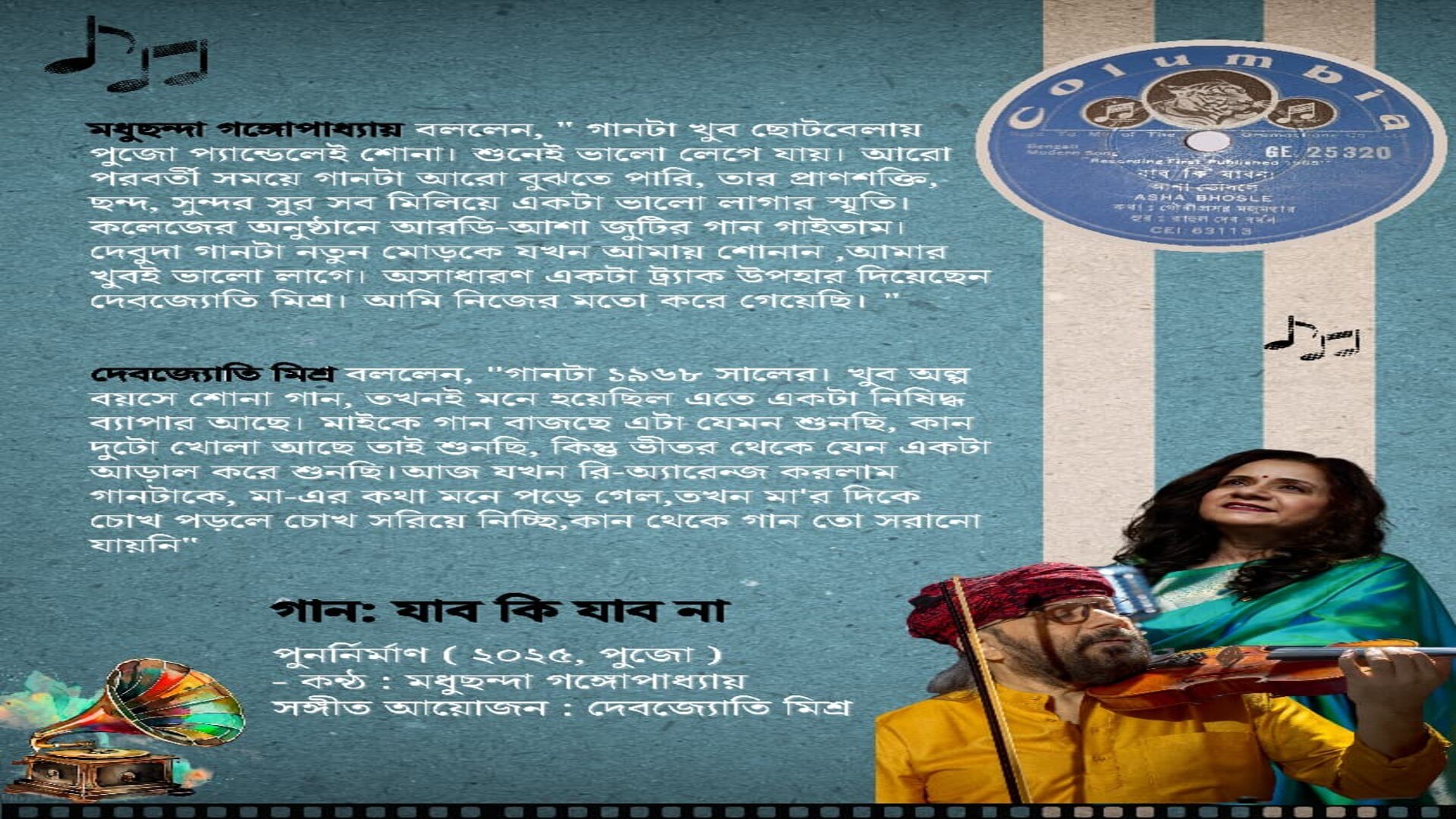 উপরি পাওনা গানের বুকলেট। এক সময় শারদ অর্ঘ্য প্রকাশিত হতো। আর ছায়াছবির বুকলেট। সেই নস্টালজিয়া ফিরিয়ে আনতে গানের বুকলেট প্রকাশ করলেন দেবজ্যোতি ও মধুছন্দা। তাতে আছে অরিজিনাল ৭৮ আরপিএম এর সেই ১৯৭৮ এ প্রকাশিত রেকর্ড এর ছবি। রেকর্ডের নাম্বার, উল্টো পিঠের গানের রেকর্ড লেবেল, আরডি-আশা জুটির কিছু কম দেখতে পাওয়া ছবি, গানের কথা ( গীতিকার – গৌরীপ্রসন্ন মজুমদার), দেবজ্যোতি মিশ্র ও মধুছন্দা গঙ্গোপাধ্যায় এর এই গান নিয়ে কিছু কথা।