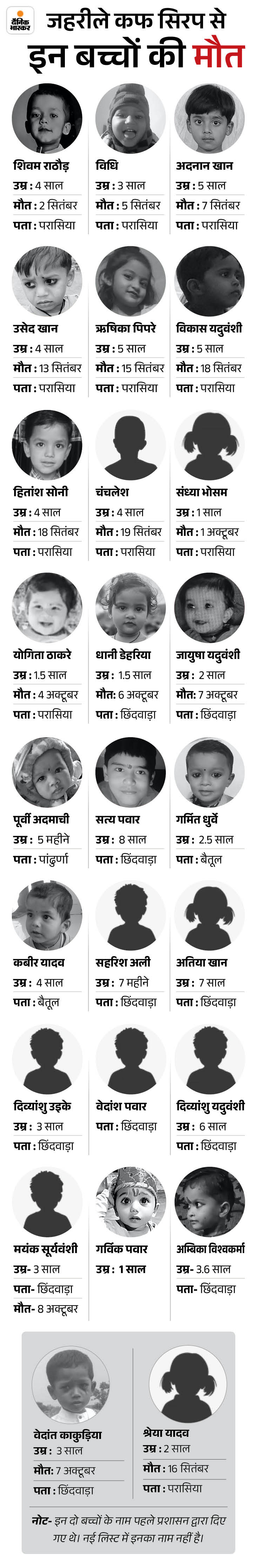 এই সংবাদটিও পড়ুন: কাশি সিরাপের মামলা- ছিন্দওয়ারার আরেক সন্তানের মৃত্যু; এমপিতে মৃত্যুর সংখ্যা 26 এ পৌঁছেছে বিষাক্ত কাশি সিরাপের কারণে শিশুদের মৃত্যুর ধারাবাহিকতা ছিন্দোয়ারা জেলায় থামছে না। বুধবার সকালে, চাওরাই অঞ্চল থেকে 3 বছর 6 মাস বয়সী অম্বিকা বিশওয়াকর্মা, নাগপুরে চিকিত্সার সময় মারা যান। এই মৃত্যুর সাথে সাথে মধ্য প্রদেশে সিরাপের ঘটনার কারণে মারা যাওয়া শিশুদের সংখ্যা এখন ২ 26 টি পৌঁছেছে