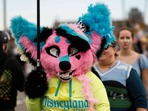 ওরেগনের পোর্টল্যান্ডে ট্রাম্পের নীতির বিরুদ্ধে একটি র্যালিতে অংশ নিচ্ছেন উজ্জ্বল গোলাপী এবং নীল রঙের পশুর পোশাক পরা একজন।