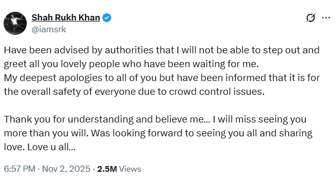 সন্ধ্যায় শাহরুখ খান মান্নাত না আসার জন্য ক্ষমা চেয়ে সোশ্যাল মিডিয়ায় একটি পোস্ট করেছেন এবং লিখেছেন-