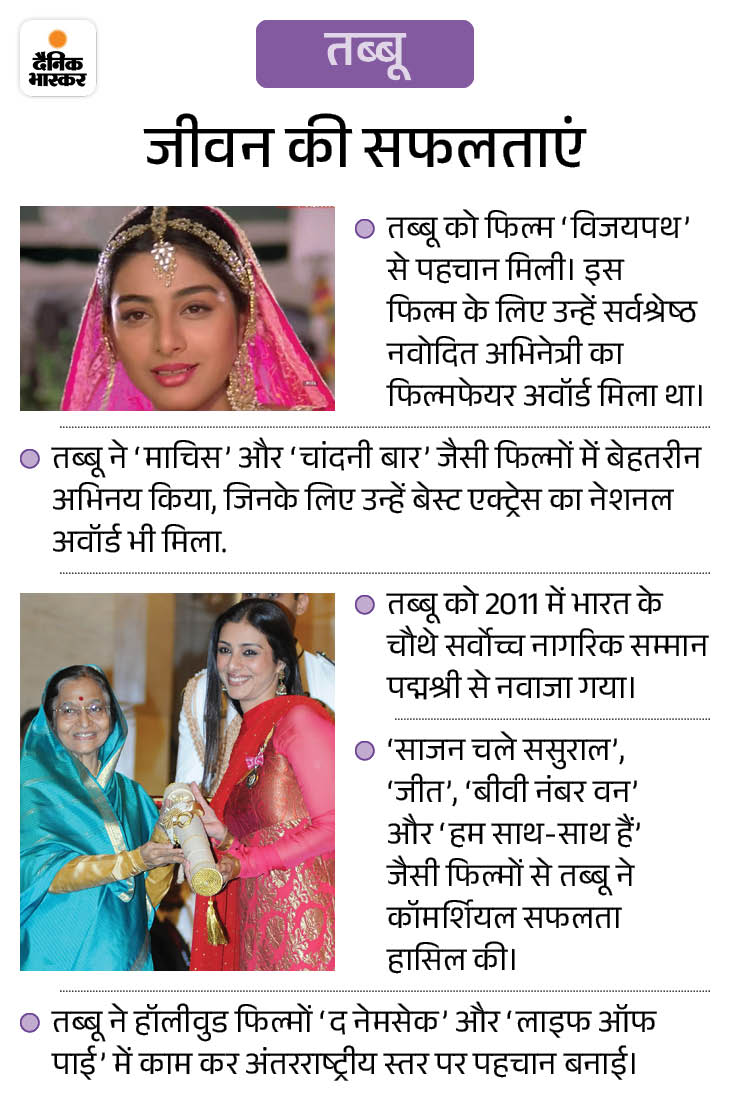 প্রতিটি চরিত্রে নতুন চ্যালেঞ্জ গ্রহণ করে সিনেমাকে সমৃদ্ধ করেছেন টাবু। ব্যক্তিগত জীবনে উত্থান-পতন এবং বিতর্ক সত্ত্বেও তিনি ভারসাম্য বজায় রেখেছিলেন। টাবু, যিনি পদ্মশ্রী পুরষ্কার পেয়েছিলেন, এখনও তার দৃঢ় অভিনয়, সরলতা এবং গভীর চিন্তাভাবনা দিয়ে অনুপ্রেরণা হয়ে আছেন।
