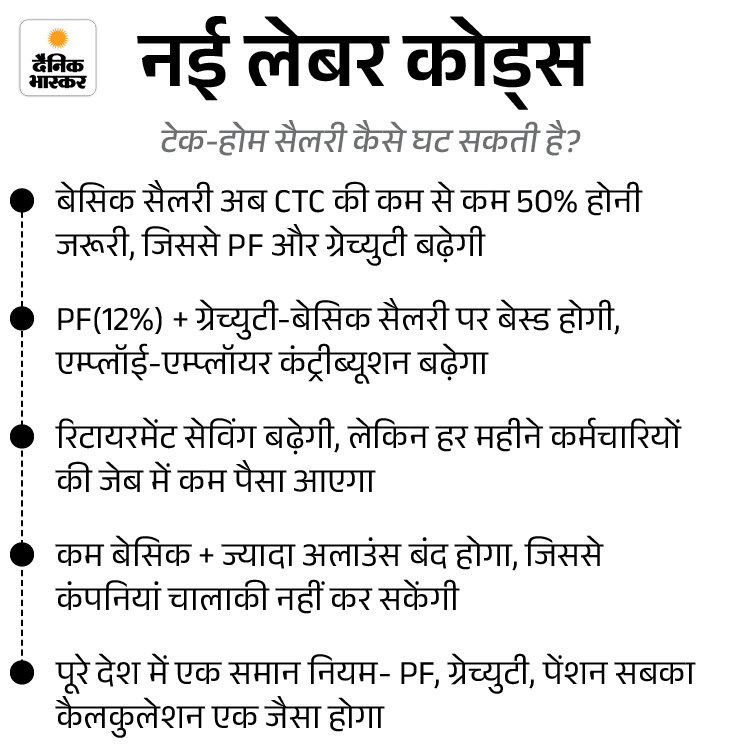 কেন্দ্রীয় সরকার 29টি পুরানো শ্রম আইনকে চারটি নতুন কোডে একীভূত করেছে। এই কোডগুলি মজুরি, শিল্প সম্পর্ক, সামাজিক নিরাপত্তা এবং নিরাপত্তা-স্বাস্থ্যের উপর রয়েছে। মজুরি কোড 21 নভেম্বর 2025 থেকে কার্যকর হয়েছে৷ যার অধীনে সংস্থাগুলিকে এখন বেতন কাঠামো পরিবর্তন করতে হবে, যেখানে মূল বেতন মোট CTC এর কমপক্ষে 50% হতে হবে৷