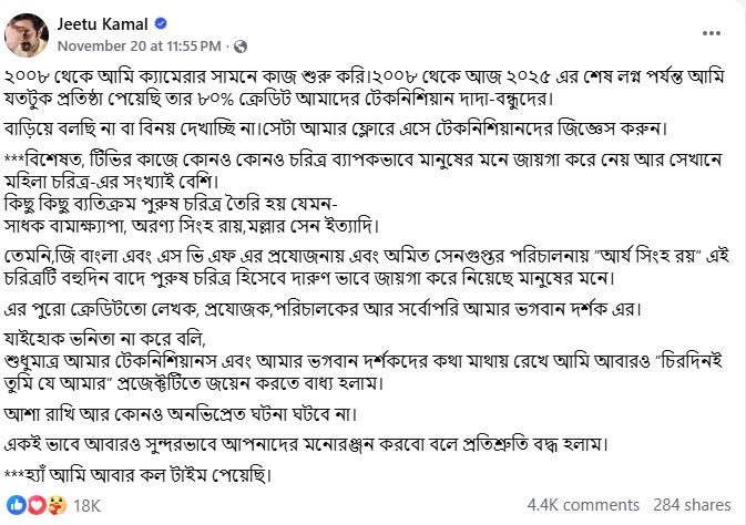 এই প্রসঙ্গে জানতে যোগাযোগ করা হয়েছিল সোহন বন্দ্যোপাধ্যায়ের সঙ্গে। তিনি জানিয়েছেন, ‘দিতিপ্রিয়া এখনও পর্যন্ত অফিসিয়ালি কিছু জমা দিয়েছে বলে আমার জানা নেই। কারও সঙ্গে ব্যক্তিগতস্তরে আলোচনা করতেই পারে। সেটা যতক্ষণ পর্যন্ত অফিসিয়াল হচ্ছে ততক্ষণ কিছু বলা সম্ভব নয়। তবে কাল (শনিবার) আমরা চ্যানেল, প্রযোজনা সংস্থার সঙ্গে মধ্যস্থতা করে সমস্যার সমাধান খোঁজার চেষ্টা করেছি। ফাইনাল রেজাল্ট পাওয়া যাবে সোমবার। সেদিন একটা চূড়ান্ত সিদ্ধান্ত হবে।’