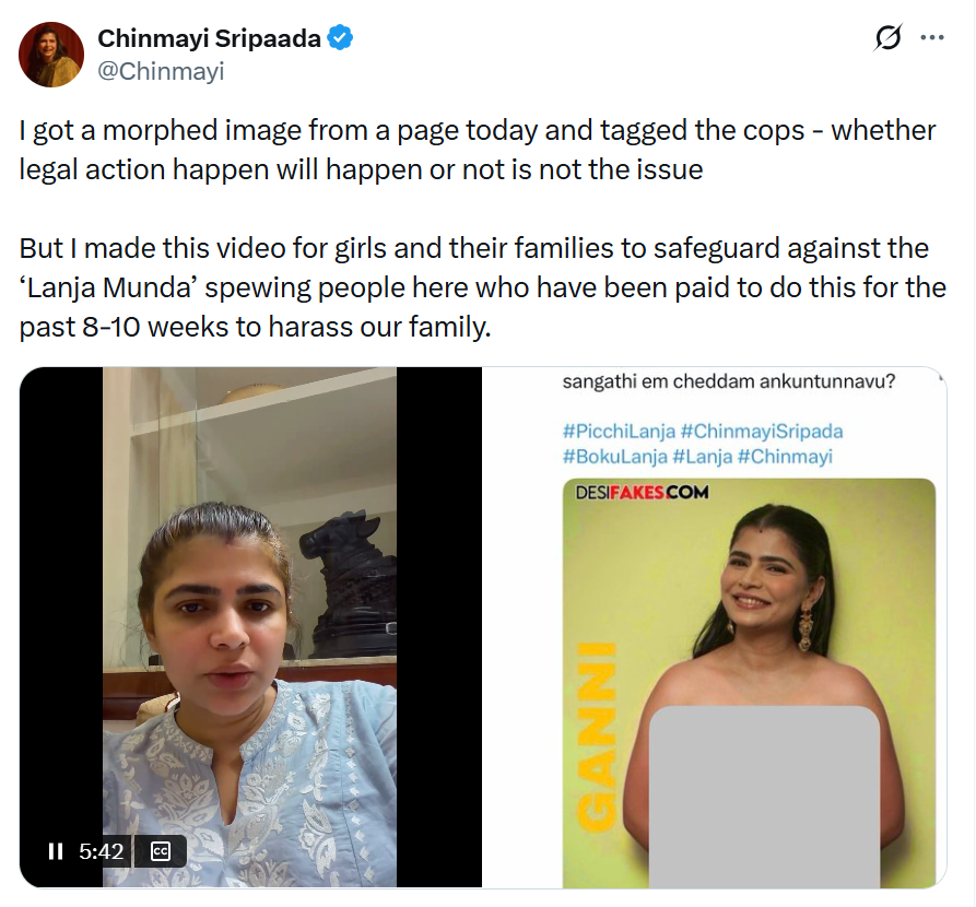 চিন্ময়ী সেই মর্ফ করা ছবি অস্পষ্ট করে তার অ্যাকাউন্টে শেয়ার করেছেন। এছাড়া সোশ্যাল মিডিয়ায় একটি ভিডিও পোস্টের মাধ্যমেও এ বিষয়টি উঠে এসেছে।