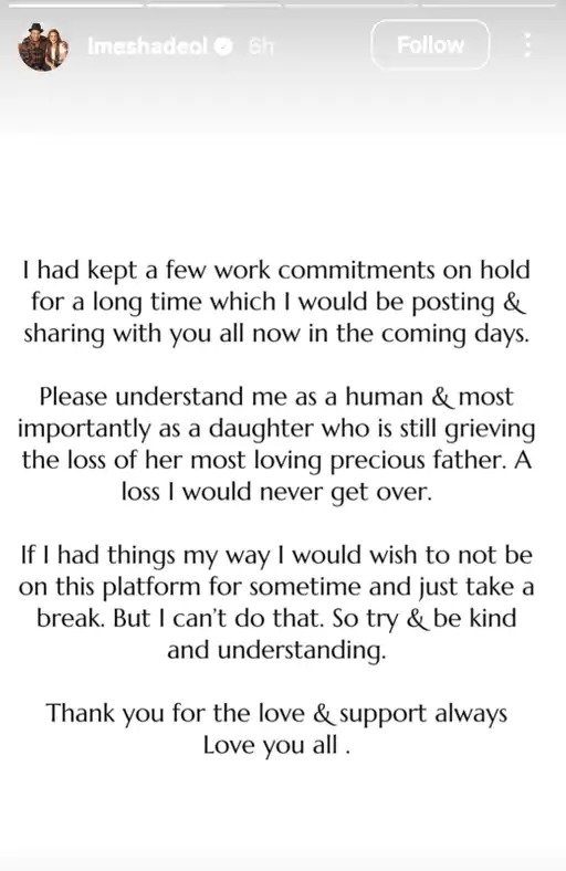 আমরা আপনাকে বলি যে প্রায় এক সপ্তাহ আগে, ইশা তার বাবার মৃত্যুর পরে কাজ এবং সোশ্যাল মিডিয়ায় ফিরে আসার বিষয়ে তার ইনস্টাগ্রাম গল্পে তার ব্যথা প্রকাশ করেছিলেন।