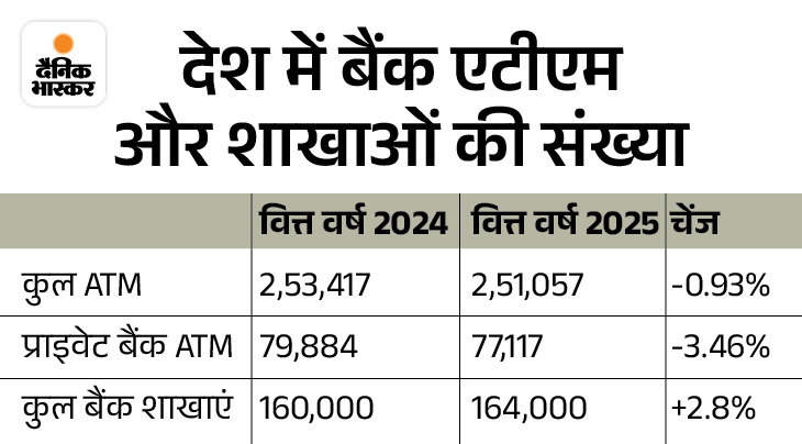 31 মার্চ, 2025 সাল নাগাদ, দেশে মোট ATM-এর সংখ্যা ছিল 2,51,057, যেখানে গত বছর (2024 অর্থবছর) এই সংখ্যা ছিল 2,53,417৷ আরবিআই বলেছে যে গ্রাহকরা নগদ তোলার পরিবর্তে প্রতিদিনের লেনদেনের জন্য ডিজিটাল চ্যানেলগুলি বেশি ব্যবহার করছেন, যা এটিএমগুলির প্রয়োজনীয়তা হ্রাস করেছে।
