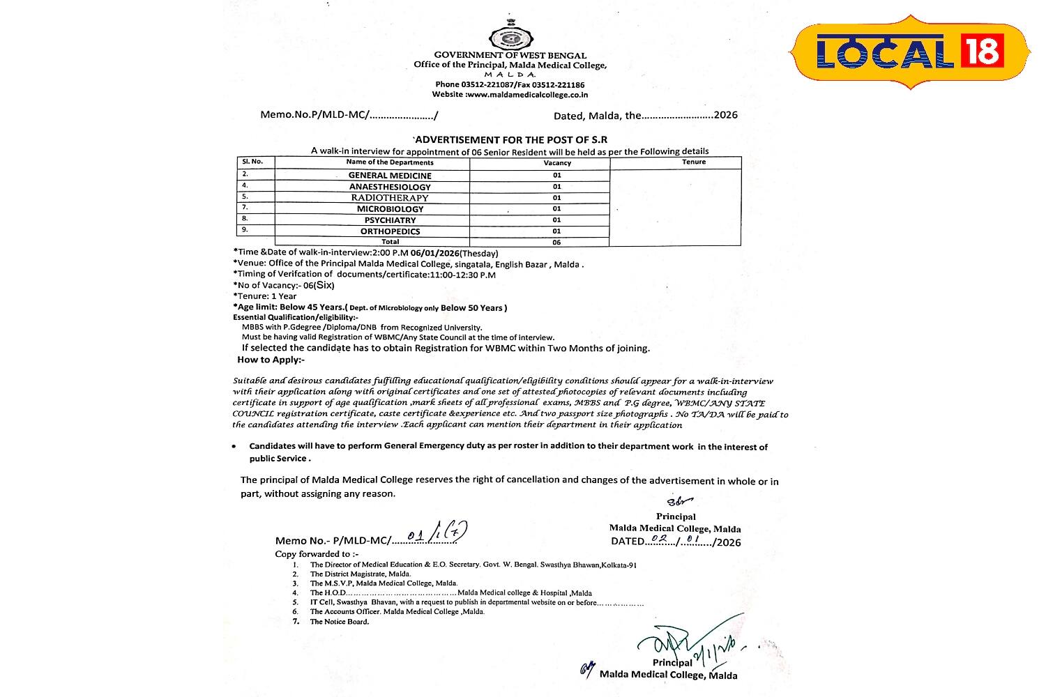 জেলা প্রশাসন ও রাজ্য স্বাস্থ্য বিভাগের নিজস্ব ওয়েবসাইটে বিজ্ঞপ্তি জারি করে এমনটাই জানান হয়েছে স্বাস্থ্য দফতরের তরফে। একাধিক বিভাগে মোট ৬ জন সিনিয়র রেসিডেন্ট নিয়োগ করা হবে মালদহ মেডিক্যালে।(ছবি ও তথ্য: জিএম মোমিন)