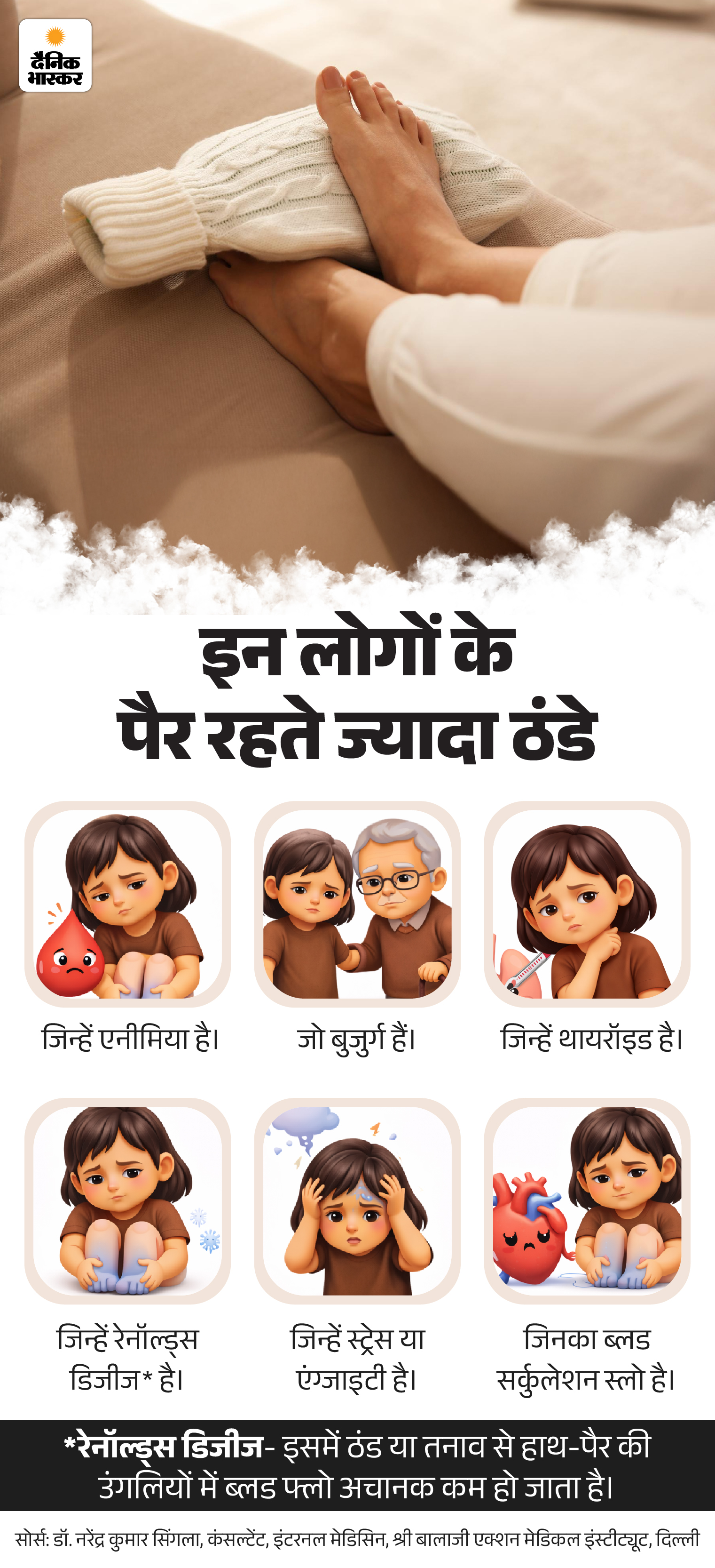 উত্তর- কারও কারও পা প্রায়ই ঠান্ডা থাকে, শীতে তারা বেশি সমস্যায় পড়েন। ঘুমেও এর প্রভাব পড়ে।