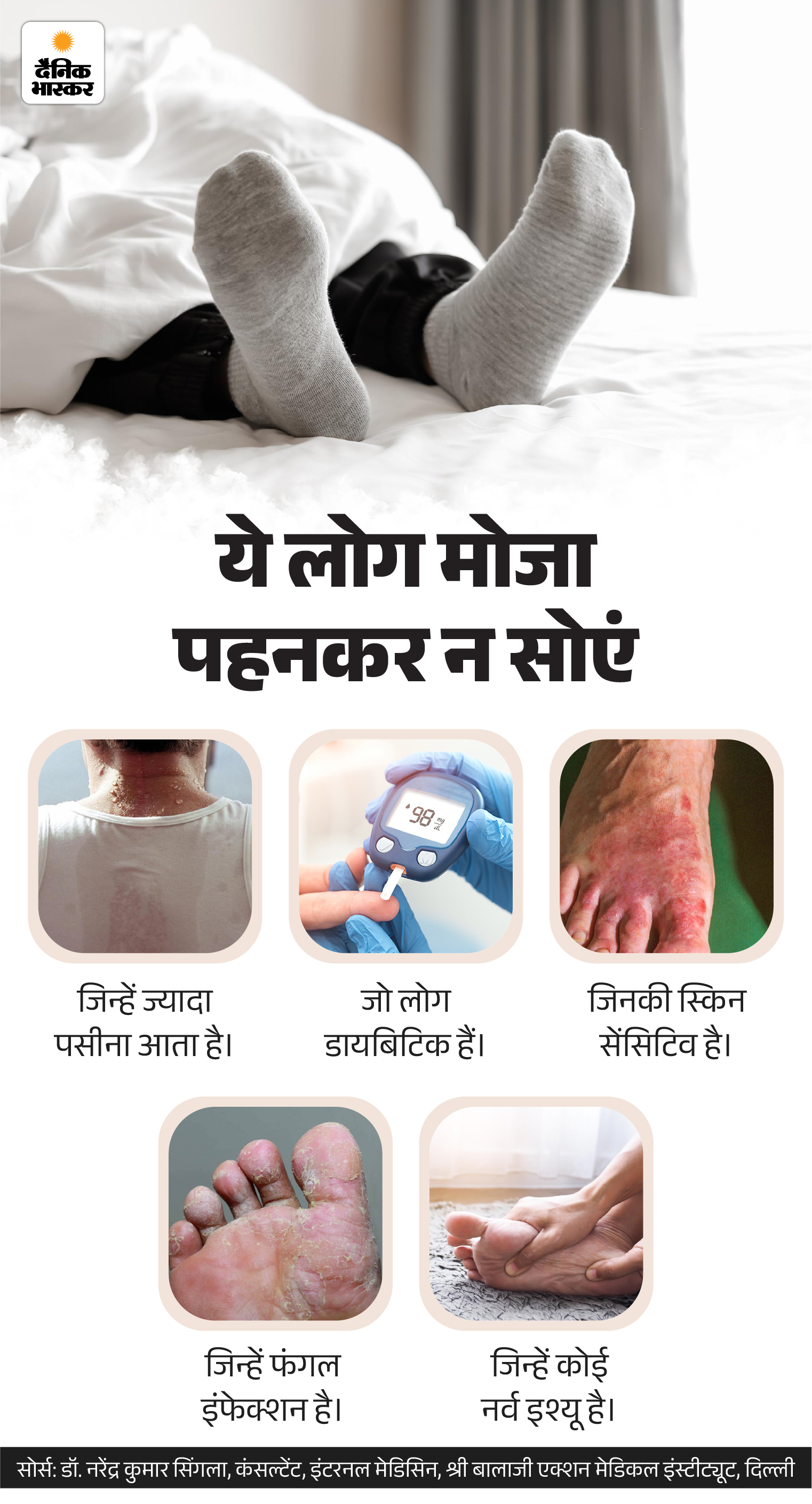 - তাই ঘুমানোর সময় সবসময় ঢিলেঢালা, পরিষ্কার, সুতি বা উলের মোজা পরার পরামর্শ দেওয়া হয়, যাতে পা শুষ্ক ও নিরাপদ থাকে।