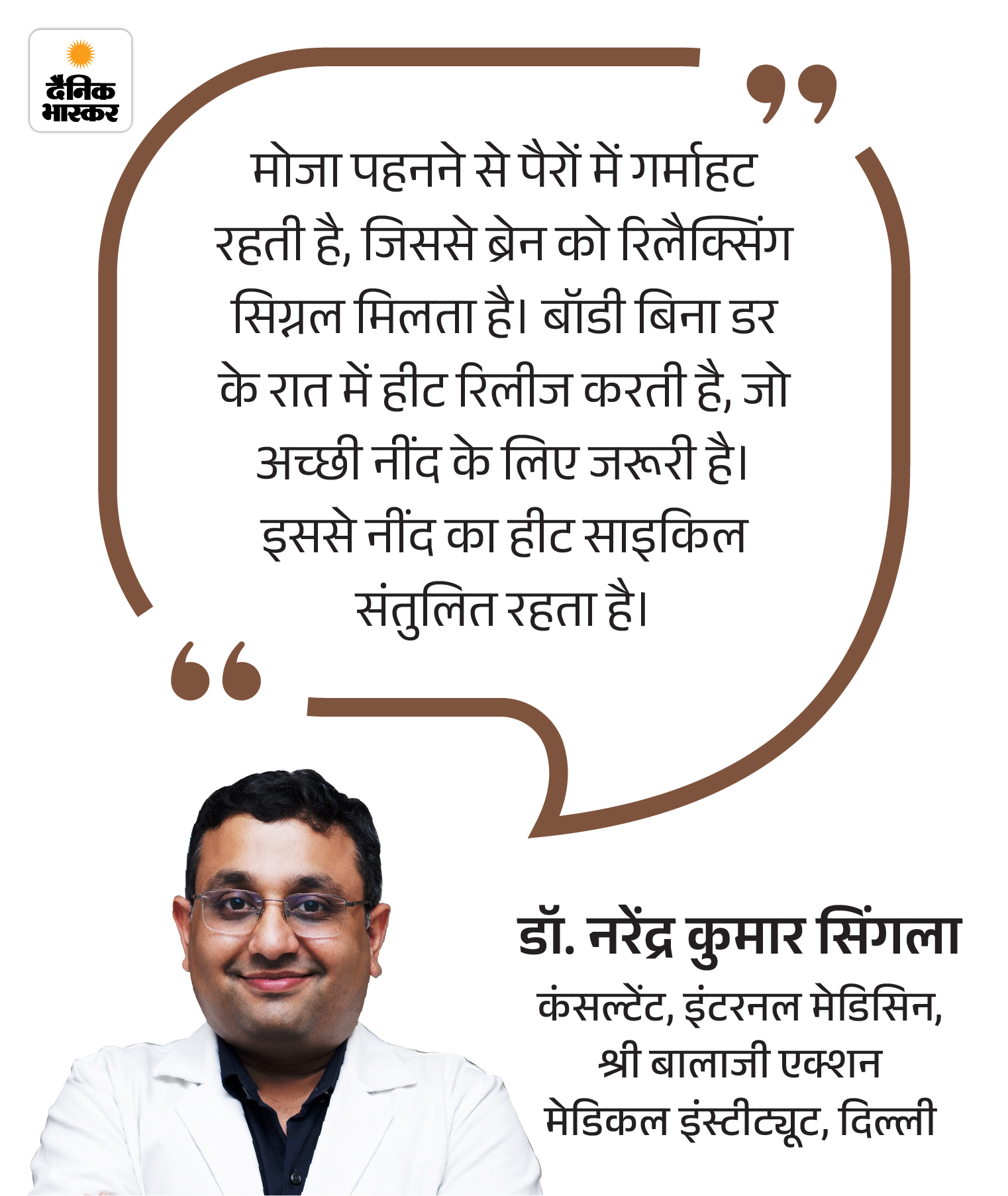 - এর বিজ্ঞান হল মোজা পরলে পা উষ্ণ থাকে, যা রক্তনালীকে প্রসারিত করে। এই প্রক্রিয়াটিকে ভাসোডিলেশন বলা হয়। এর ফলে শরীর রিলাক্সেশন মোডে চলে যায় এবং ঘুম হয়।