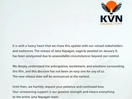 আমরা আপনাকে জানিয়ে রাখি যে এর আগে, থালাপথি বিজয়ের ছবি জান নায়কন 9 জানুয়ারি মুক্তি পাওয়ার কথা ছিল কিন্তু মুক্তি পিছিয়ে দেওয়া হয়েছিল। ফিল্মটির প্রোডাকশন হাউস কেভিএন প্রোডাকশন একটি বিবৃতি জারি করে বলেছে, “আমাদের এই তথ্যটি জানাতে হচ্ছে ভারাক্রান্ত হৃদয়ে। জান নায়কান ছবিটি, যেটি 9 জানুয়ারি মুক্তি পাওয়ার কথা ছিল, কিছু কারণে স্থগিত করা হয়েছে যা আমাদের নিয়ন্ত্রণের বাইরে ছিল।”