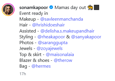 ছবিতে সোনমকে কালো পোশাকে দেখা যাচ্ছে। তিনি একটি কালো হাই-নেক ক্রপ টপ পরেছেন যার উপরে একটি স্ট্রাকচার্ড ব্লেজার রয়েছে।
