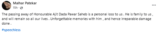 অজিত পাওয়ারকে স্মরণ করে, মালহার তার পোস্টে লিখেছেন যে অজিত পাওয়ারের চলে যাওয়া তার জন্য একটি ব্যক্তিগত ক্ষতি। তিনি বলেছিলেন যে পাওয়ার তাঁর পরিবারের মতো ছিলেন এবং সবসময়ই থাকবেন। তার সাথে কাটানো মুহূর্তগুলো কখনো ভোলা যায় না। মালহার আরও লিখেছেন, এই ক্ষতি কখনো পূরণ করা যাবে না।