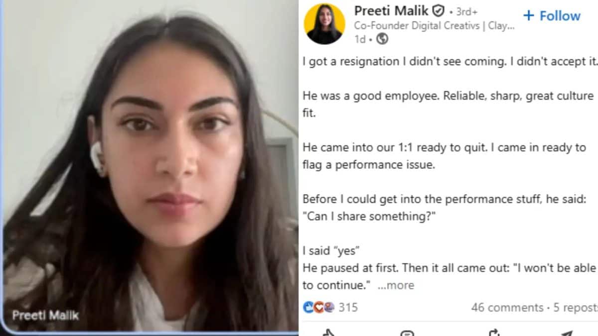 ডিজিটাল ক্রিয়েটিভস-এর সহ-প্রতিষ্ঠাতা প্রীতি মালিক সম্প্রতি LinkedIn-এ শেয়ার করেন, কীভাবে তিনি পদত্যাগ করতে চাওয়া এক দক্ষ কর্মীকে সংস্থায় ধরে রাখতে সক্ষম হন। তাঁর মতে, এই পদত্যাগের সিদ্ধান্তটি ছিল সম্পূর্ণ অপ্রত্যাশিত।