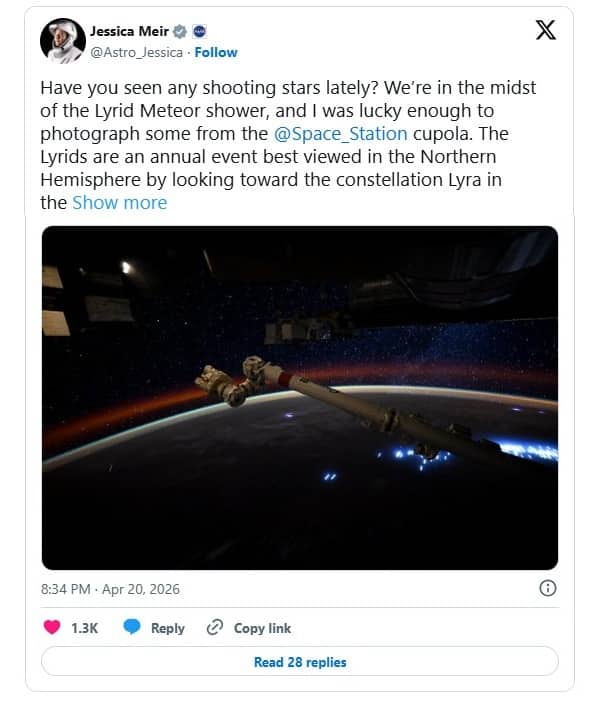 কক্ষপথ থেকে বার্ষিক উল্কাবৃষ্টির বিরল দৃশ্যলিরিড উল্কাবৃষ্টি প্রতি বছরই এপ্রিলের ২১ ও ২২ তারিখের মধ্যে সর্বোচ্চ সক্রিয়তায় পৌঁছায়। এটি সবচেয়ে প্রাচীন এবং বহুল পর্যবেক্ষিত বার্ষিক আকাশীয় ঘটনার মধ্যে একটি। এ বছর সেই শিখর সময়েই কক্ষপথ থেকে এই দুর্দান্ত ছবি তোলা হয়েছে, যা মাটিতে দাঁড়িয়ে দেখা সম্ভব নয়।