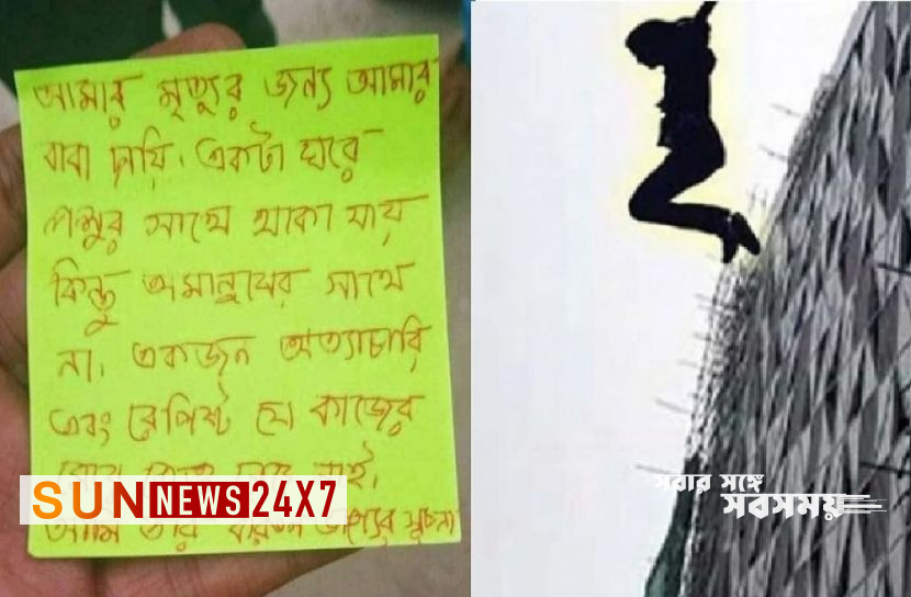সান নিউজ ডেস্ক: রাজধানীর দক্ষিণখান মোল্লারটেক এলাকার একটি ১০ তলা ভবনের ছাদ থেকে লাফিয়ে পড়ে সানজানা (২১) নামে এক তরুণীর আত্মহত্যার ঘটনা ঘটেছে। ঘটনাস্থল থেকে একটি সুইসাইড নোট উদ্ধার করেছে পুলিশ। সেখানে নিজের বাবাকে ‘রেপিস্ট’ ও ‘অমানুষ’ উল্লেখ করে লেখা আছে, আমার মৃত্যুর জন্য আমার বাবা দায়ী।