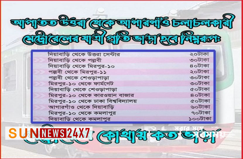 আপাতত উত্তরা থেকে আগারগাঁও চলাচলকারী মেট্রোরেলের যাত্রী প্রতি ভাড়া হবে নিম্নরূপ: